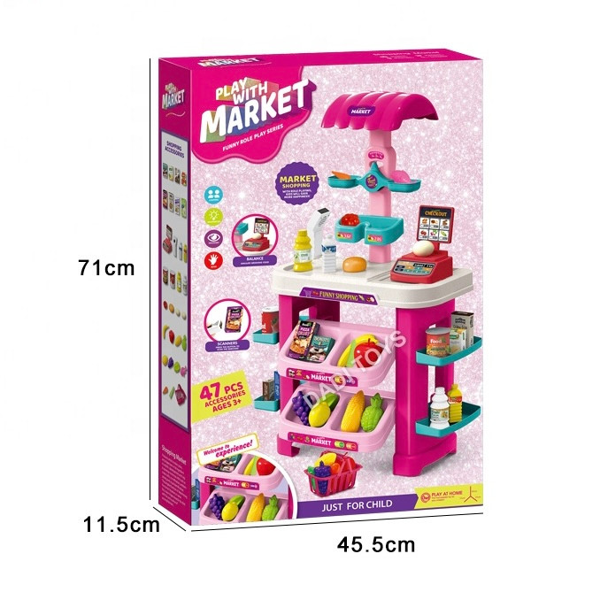 - ۴۹ قطعه لوازم جانبی: این مجموعه شامل 47 قطعه لوازم جانبی متنوع از جمله میوهها، سبزیجات، قوطیها، بطریها و … است که به کودک شما امکان میدهد تا یک سوپرمارکت کامل را بچیند و ساعتها با آن سرگرم شود.