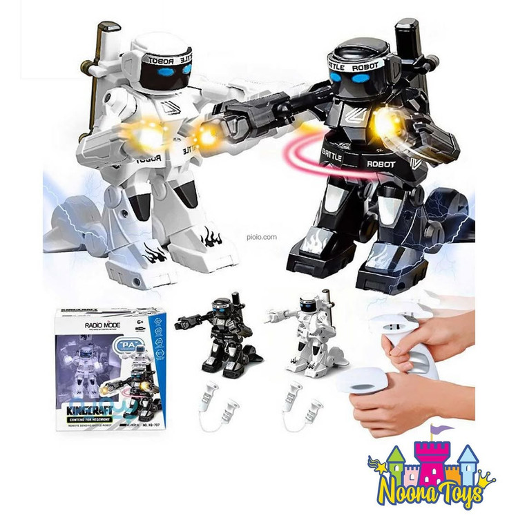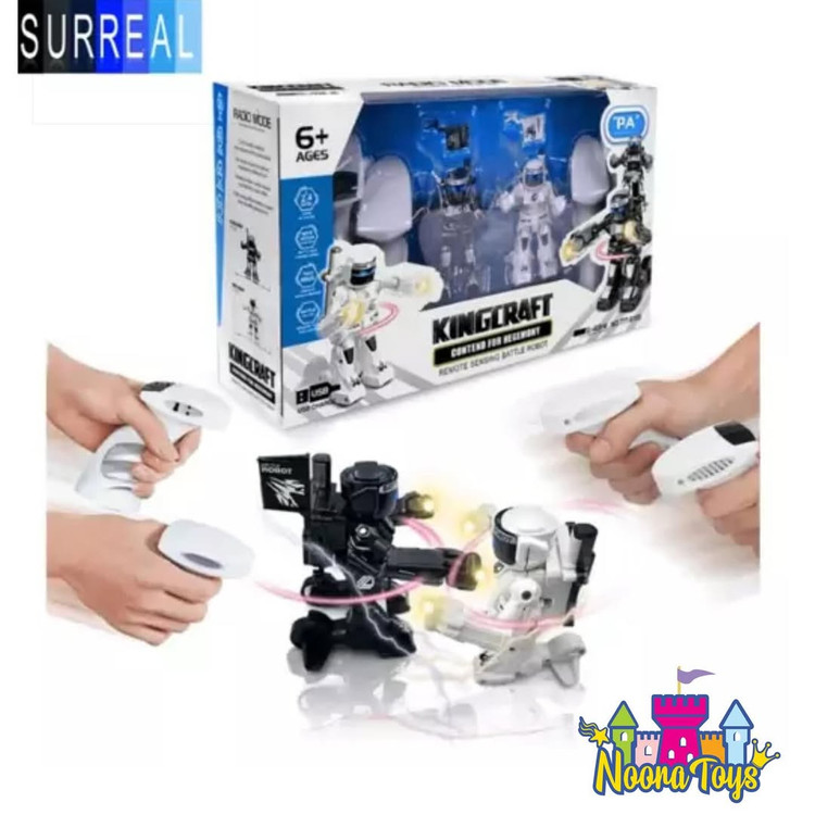 ربات کنترلی دومبارز مدل kingcraft بسته شامل بات رزمی، 2 مجموعه کنترل از راه دور بی سیم، 2 کابل USB و یک دفترچه راهنمای دستورالعمل است. توضیحات باتری و ریموت کنترل: ربات ها دارای باتری قابل شارژ هستند ولی دسته های کنترل احتیاج به باتری قلمی دارند. ریموت کترل نیازمند چهار عدد باتری نیم قلمی نوع AAA برای هرکدام از ربات ها (داخل جعبه محصول موجود نمی باشد) 25 دقیقه شارژ برای 25 دقیقه بازی بی سیم. فرستنده 2.4 گیگاهرتز در 2 حالت پخش موجود است: کنترل حس حرکتی یا کنترل از راه دور. می توانید آن را تکان دهید یا دکمه ها را برای کنترل ربات فشار دهید