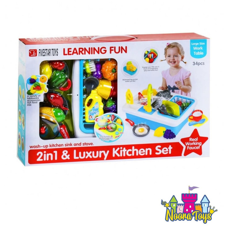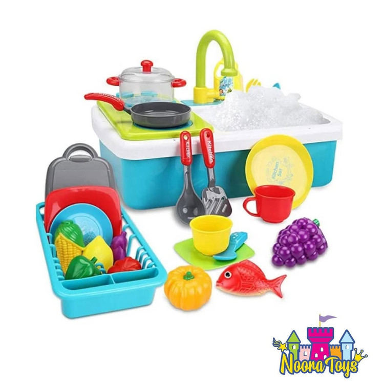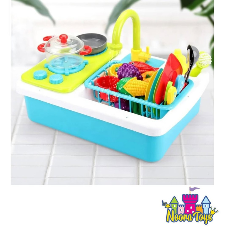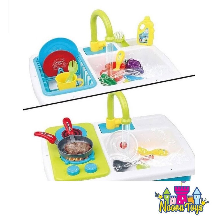 اسباب بازی سینک ظرفشویی کودک همراه با اجاق گاز بزرگ در زیر سینک ظرفشویی کودک مخزن آبی قرار دارد که آب شیر از آن تامین میشود و دوباره به مخزن باز می گردد. مناسب برای کودکان بالا 3 سال می باشد. دستگیره های گاز این اسباب بازی موقع چرخاندن کلیک کلیک صدا می دهند. سینک ظرفشویی کودک با اجاق گاز از پلاستیک با کیفیت ABS ساخته شده است. دارای قابلیت ریزش آب محتویات : قطعات این سینک ظرفشویی و اجاق گاز شامل: ماهی، ماهیتابه، قابلمه، کدو، بلال، فلفل دلمه، گوجه، لیمو، انگور، بادمجون، مایع ظرفشویی، برس ظرفشویی و تعدادی ملاقه، ظروف و قاشق چنگال میباشد. نیاز به 2 عدد باتری