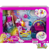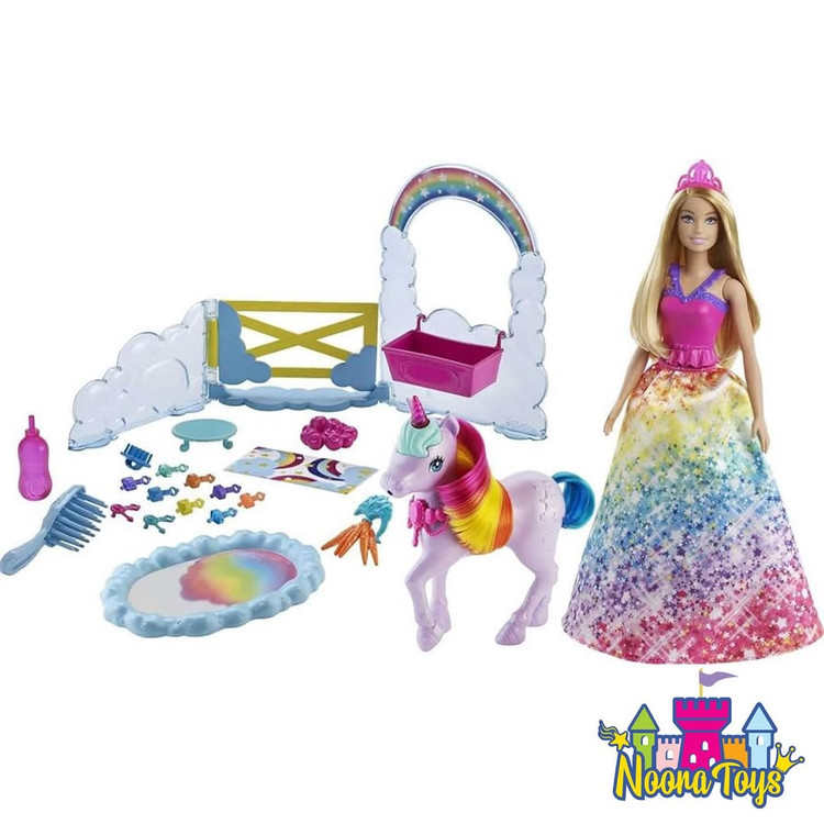 عروسک باربی و اسب شاخدار باربی دریمتوپیاBarbie عروسک و اسب شاخدار باربی دریمتوپیا این مجموعه بازی، بازی مراقبت از حیوانات خانگی را با داستان سرایی الهام گرفته از افسانه ترکیب می کند. کودکان میتوانند از غذا دادن، آراستگی و آرایش مو لذت ببرند و در عین حال به عروسک باربی پرنسس کمک کنند تا از اسب شاخدار جادویی در سکوی ابری شکل مراقبت کند. بطری را با آب پر کنید، به بچه اسب شاخدار غذا بدهید و آن را در کاسه توالت ابری شکل قرار دهید تا از تغییر رنگ جادویی لذت ببرید. وقتی اسب شاخدار به توالت می رود، هر بار که بازی را تکرار می کنید، رنگ کاسه توالت سفید به طرز جادویی به رنگ های رنگین کمانی تبدیل می شود. موهای باربی و یال اسب شاخدار را با برس های مخصوص شانه کنید و با کسسوری دیگر به دلخواه آنها را حالت دهید.